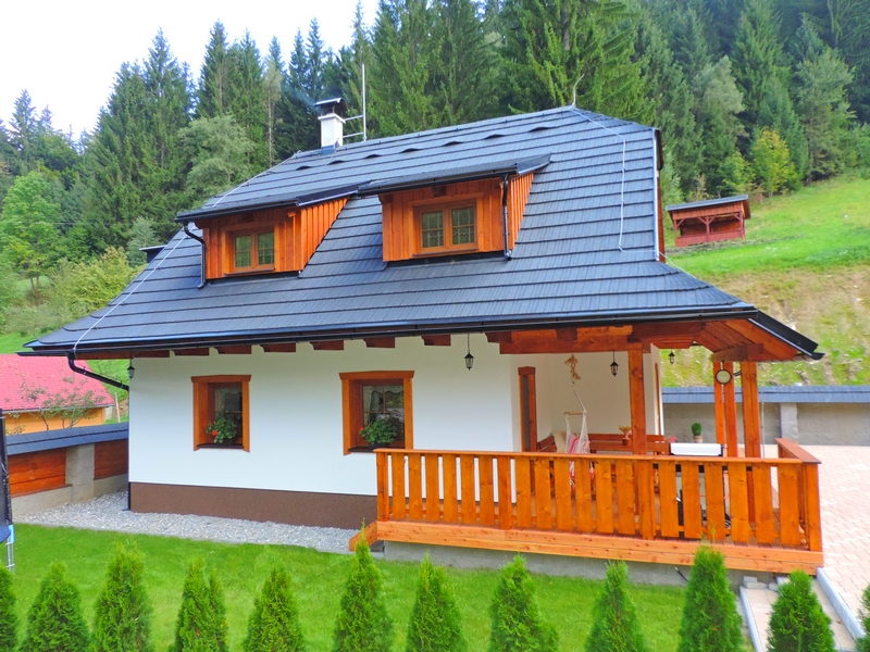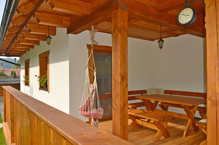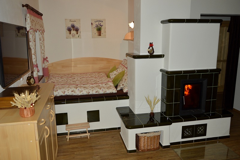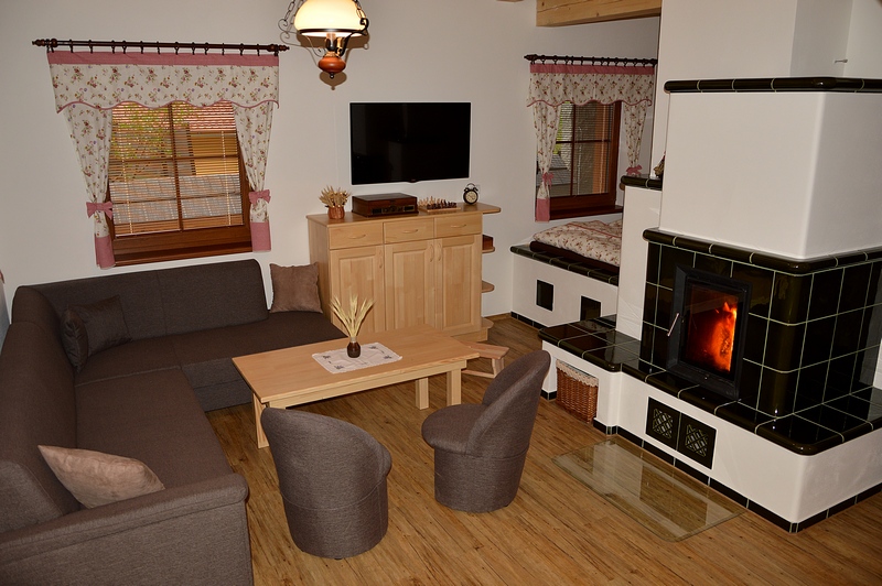 Sedací souprava a lavice u kamen tvoří velký společný prostor pro příjemné posezení. Ke stropu je možné zavěsit i dětskou houpačku.