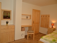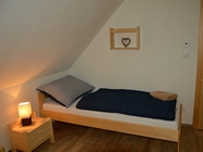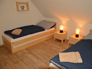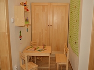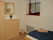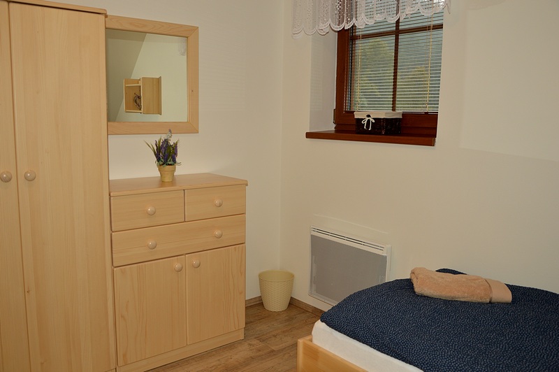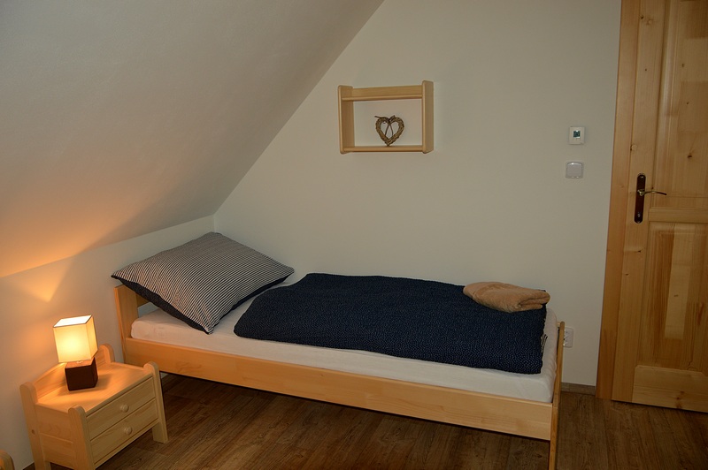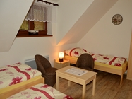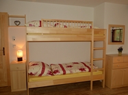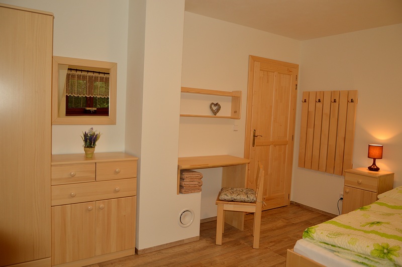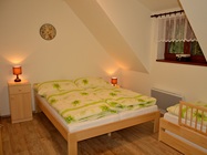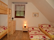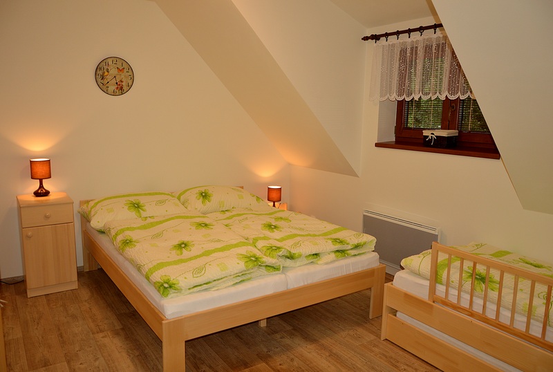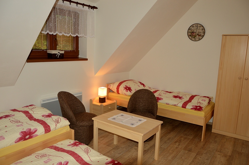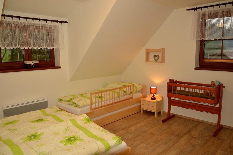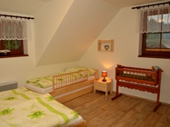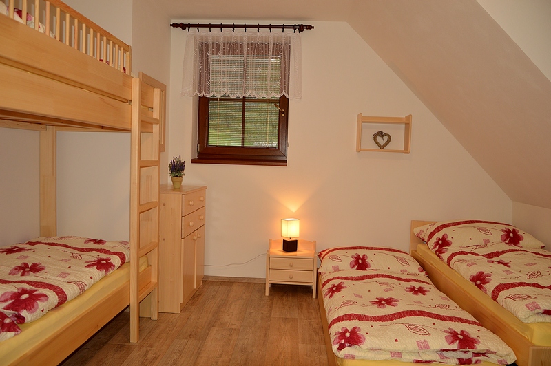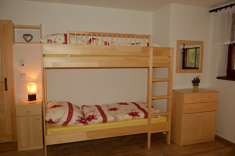 Čtyřlůžkový pokoj, z toho dvě samostatná lůžka a jedna patrová postel, možnost další vysouvací přistýlky i místo pro dětskou postýlku nebo kolébku.
