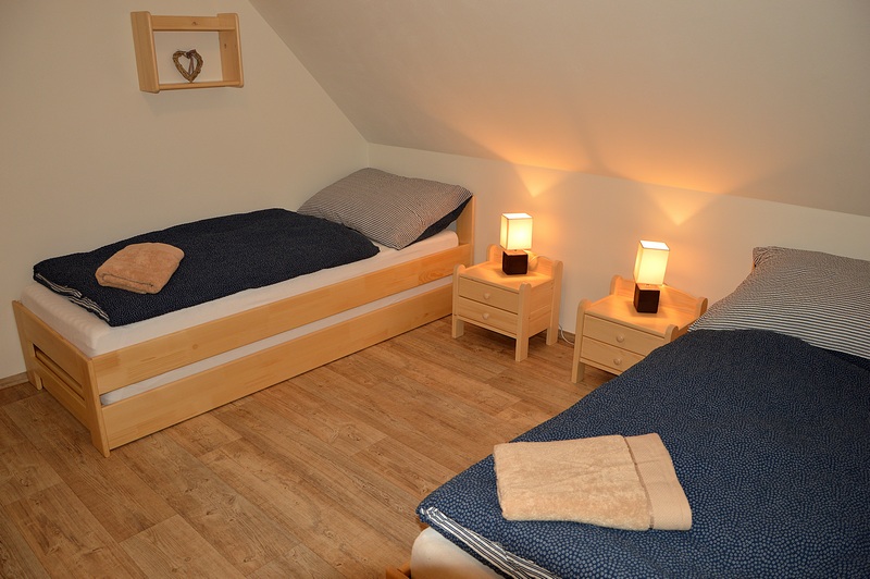 Dvoulůžkový pokoj, postele oddělené s možností jedné vysouvací přistýlky, místo taky pro postýlku nebo kolébku.