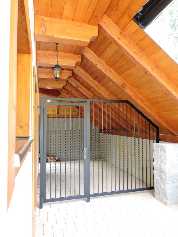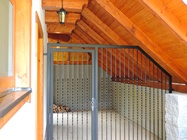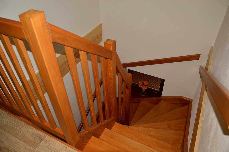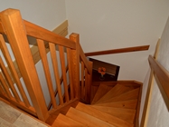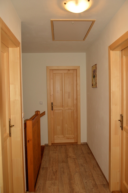 Schodiště do podkroví není prudké a dá se zabezpečit brankou jak dole, tak nahoře.