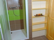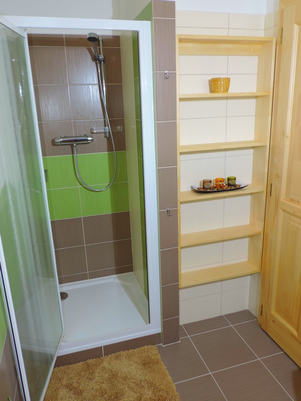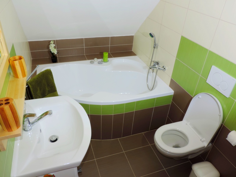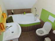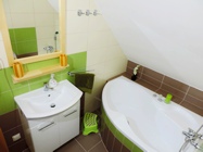 Koupelna se sprchovým koutem a vanou, do které se vejde i více dětí najednou.