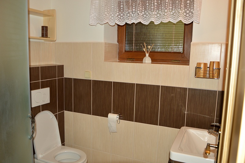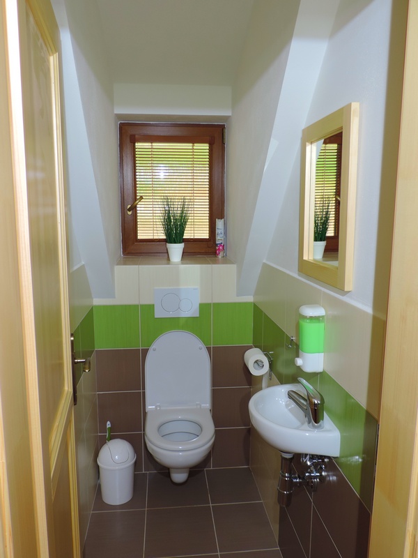 Koupelna je menší, ale má vše, co budete potřebovat, navíc vysoušeč vlasů, pro děti stupátko k umyvadlu a nočník.