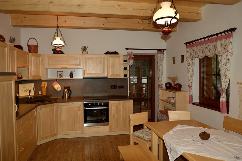 V kuchyni je lednice s mrazákem, elektrická trouba, indukční deska, myčka, konvice, mikrovlnka, ponorný mixér, šlehač, toustovač i topinkovač, překapávač na kávu.
