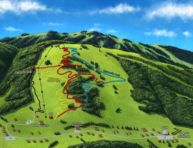 Černý trail "SCRAMBLE TRAIL", který je bezkonkurenčně nejrychlejší. Nabízí různé skoky střední obtížnosti a klopenky. Také je sjízdný i pro méně zkušené, a to díky možnosti těžší pasáže objet.